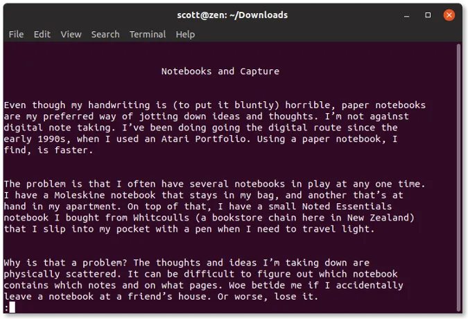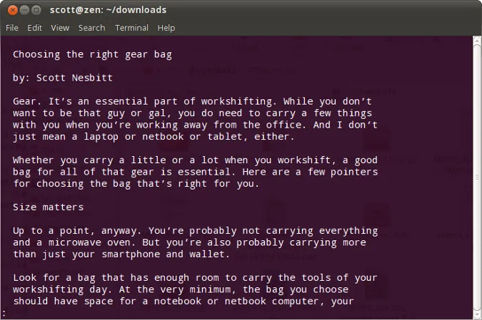 与 Antiword 一样,odt2txt 将文档转换为文本并在终端窗口中显示。和 Antiword 一样,它不会对文档进行分页。但是,你也可以使用以下命令将 odt2txt 的输出管道传输到 less 或 more 这样的实用程序中: