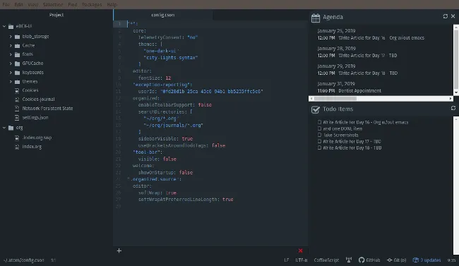 Atom 的 Organized 插件可以在屏幕右边添加一个侧边栏,用来显示 Org 文件中的日程和代办事项。默认情况下它从配置项中设置的路径中读取多个 Org 文件。Todo 侧边栏允许你通过点击未完事项来将其标记为已完成,它会自动更新源 Org 文件。