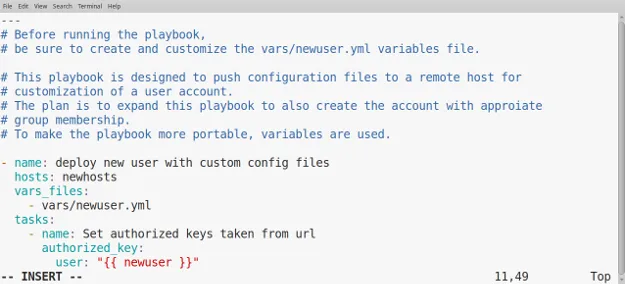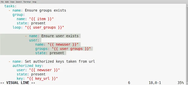 使用 Ansible 剧本或 YAML 文件时,缩进很重要。高亮显示的块可以使用 > 和 < 键向右或向左移动。