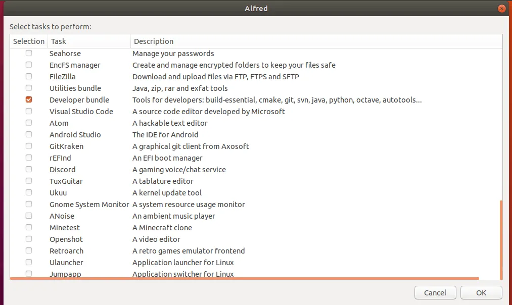 Alfred 是用 Python 语言编写的自由、开源脚本。它使用 Zenity 创建了一个简单的图形界面,用户只需点击几下鼠标即可轻松选择和安装他们选择的应用。你不必花费数小时来搜索所有必要的应用程序、PPA、deb、AppImage、snap 或 flatpak。Alfred 将所有常见的应用、工具和小程序集中在一起,并自动安装所选的应用。如果你是最近从 Windows 迁移到 Ubuntu Linux 的新手,Alfred 会帮助你在新安装的 Ubuntu 系统上进行无人值守的软件安装,而无需太多用户干预。请注意,还有一个名称相似的 Mac OS 应用,但两者有不同的用途。