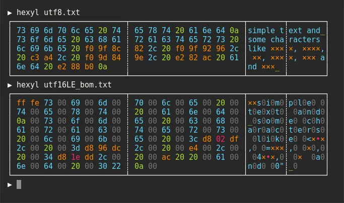 它就是 hexyl,是一个面向终端的简单的十六进制查看器。它使用颜色来区分不同的字节类型(NULL、可打印的 ASCII 字符、ASCII 空白字符、其它 ASCII 字符和非 ASCII 字符)。