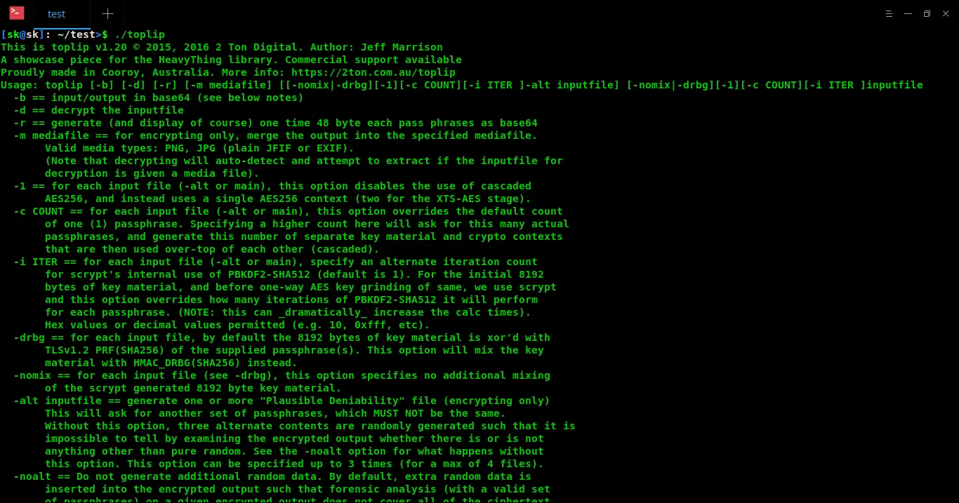 This is toplip v1.20 (C) 2015, 2016 2 Ton Digital. Author: Jeff Marrison A showcase piece for the HeavyThing library. Commercial support available Proudly made in Cooroy, Australia. More info: https://2ton.com.au/toplip file1 Passphrase #1: generating keys...Done