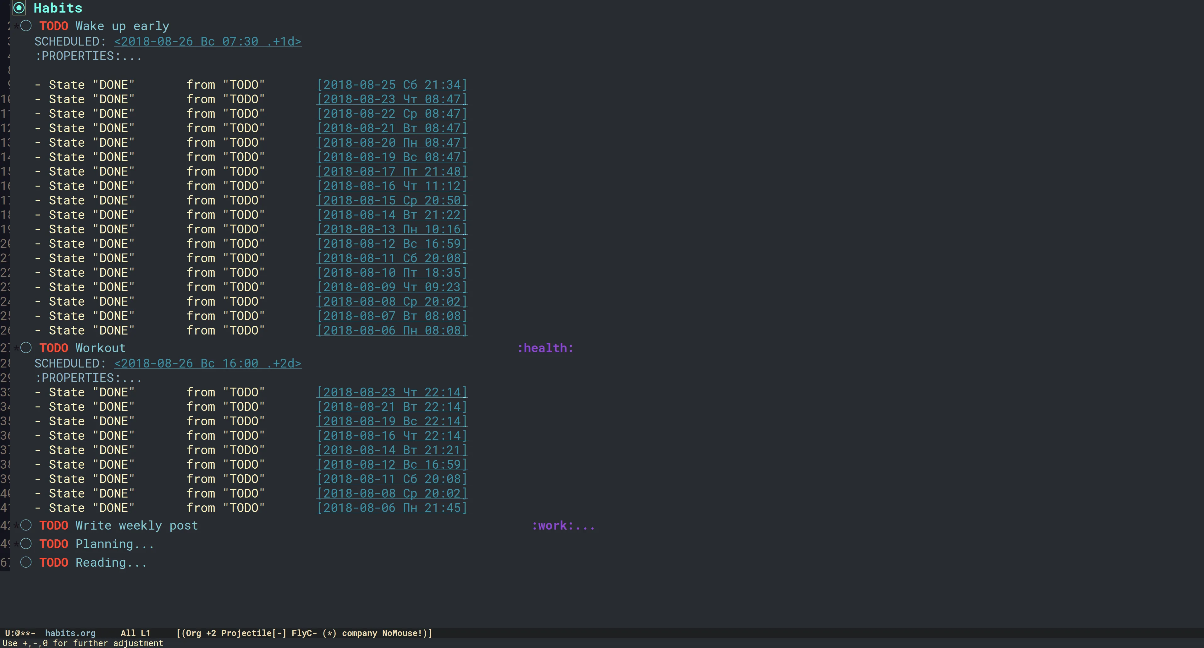根据 Org 模式的文档,Org 能够跟踪一种特殊的代办事情,称为 “习惯”。当我想养成新的习惯时,我会将该功能与日常规划功能一起连用: