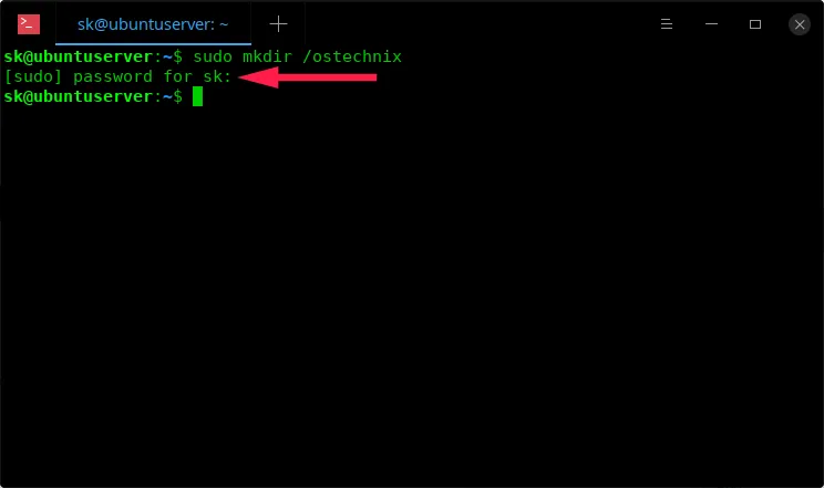 在这种情况下,用户 sk 可以运行 mkdir 和 chmod 命令而不用输入 sudo 密码。然而,当他运行 apt 命令时,就必须提供 sudo 密码了。