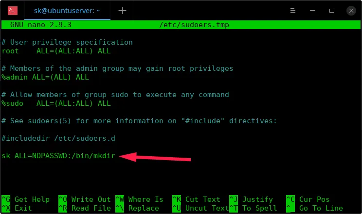 看到了吗?即便我以 sudo 特权运行 mkdir 命令,也不会弹出提示让我输入密码。从现在开始,当用户 sk 运行 mkdir 时,就不必输入 sudo 密码了。