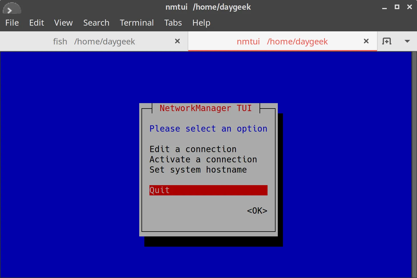 最后,选中 “Quit” 按钮来从 nmtui 终端界面离开。