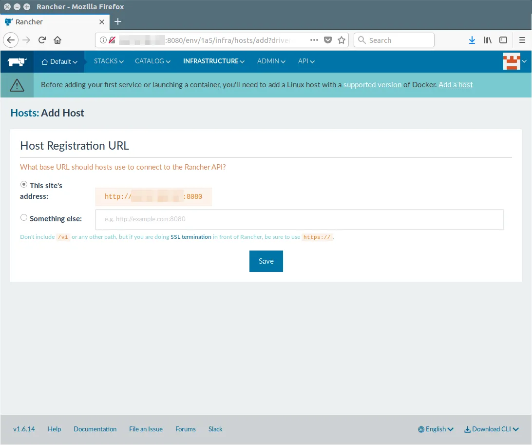 注册你的主机 URL 允许它连接到 Rancher API。这是一次性设置。