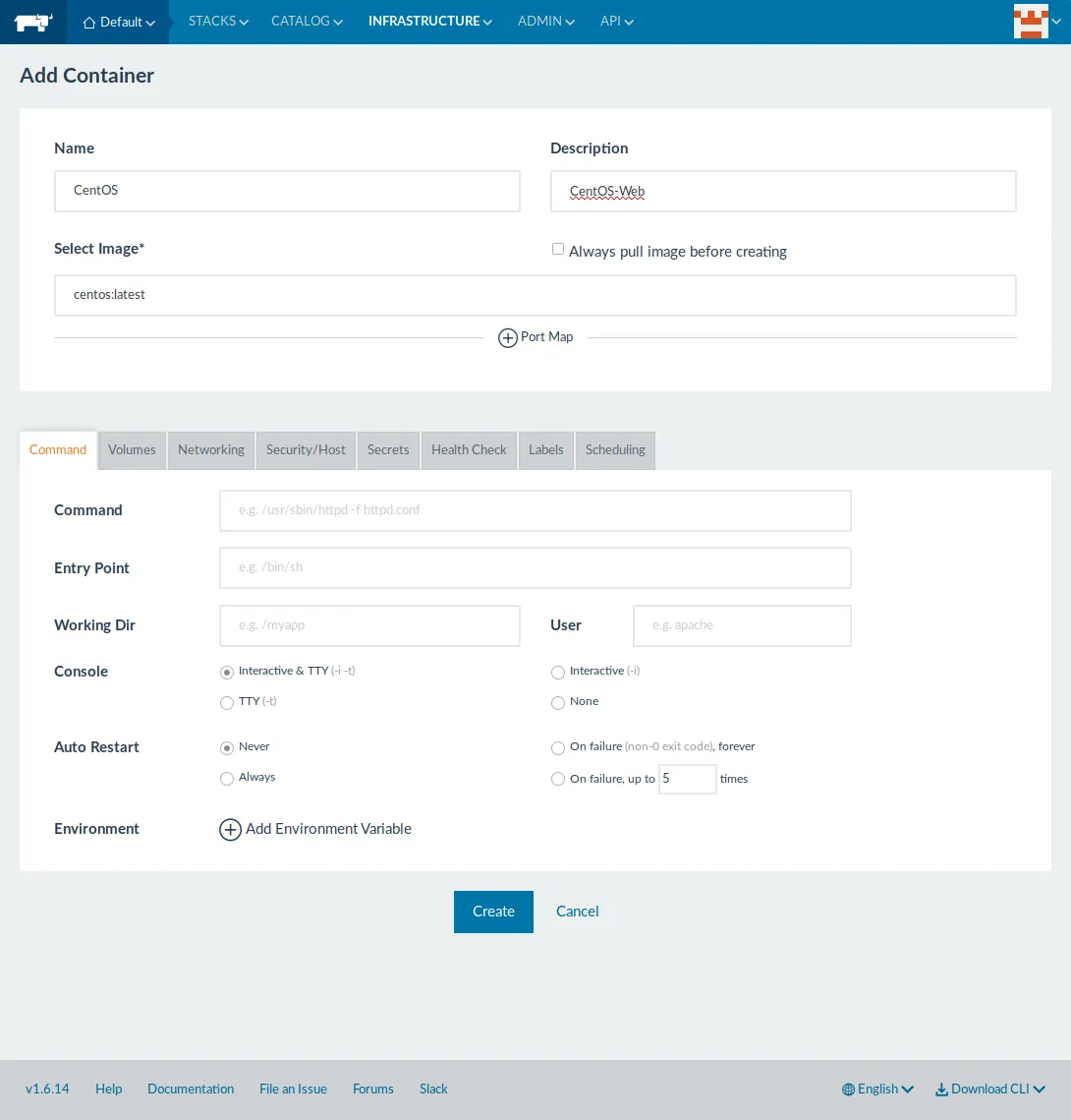 点击 “Infrastructure >> Containers >> Add Container” 然后输入每个你需要的信息。为了测试,我将创建一个 latest 标签的 CentOS 容器。