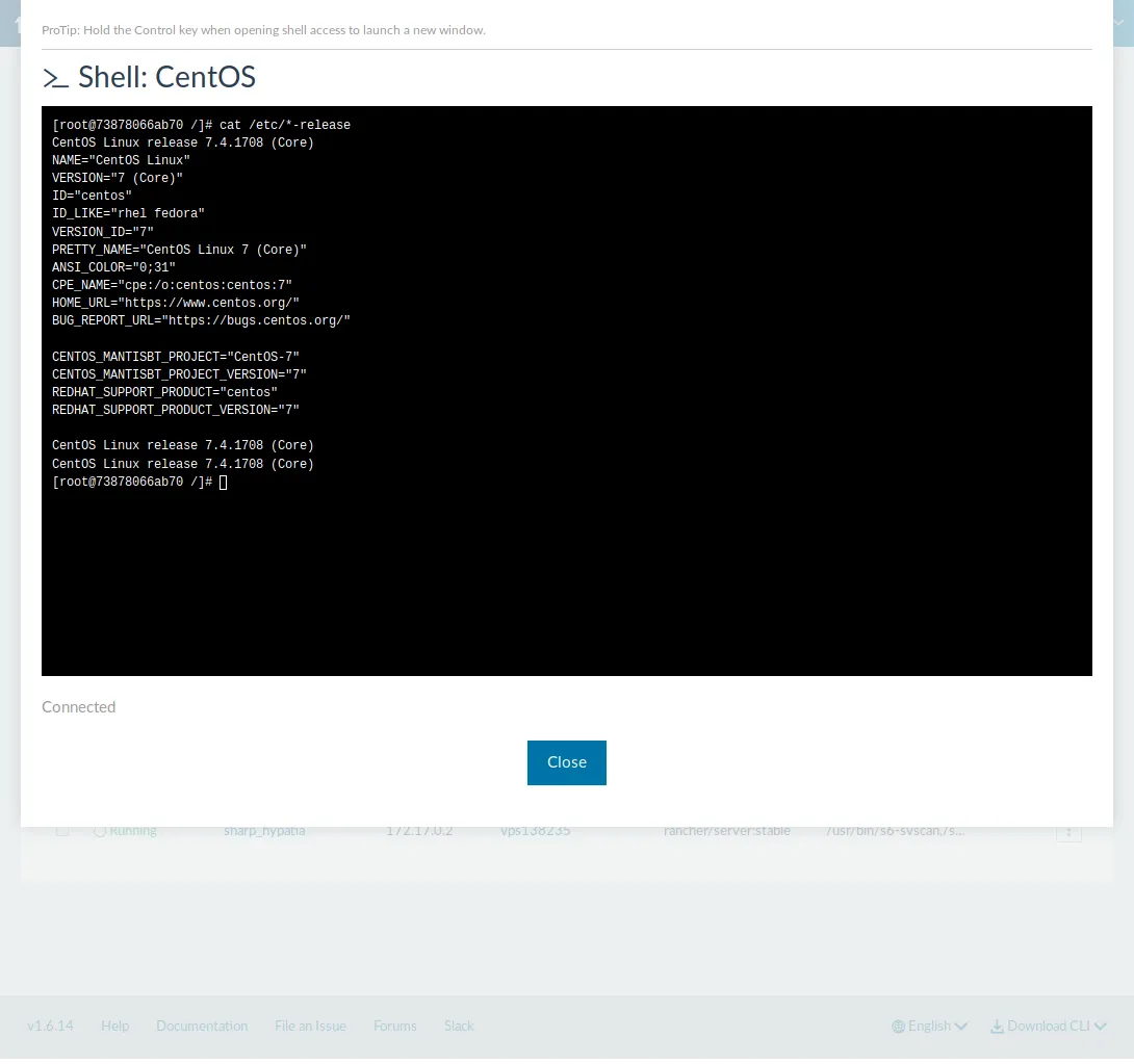 如果你想控制台访问容器,只需要点击 “Actions” 按钮中的 “Execute Shell” 选项即可。