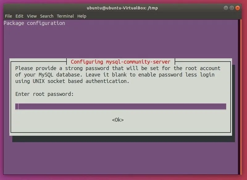 点击回车。这应该会提示你输入密码:这是在为 MySQL 设置 root 密码。不要与 Ubuntu 的 root 密码混淆