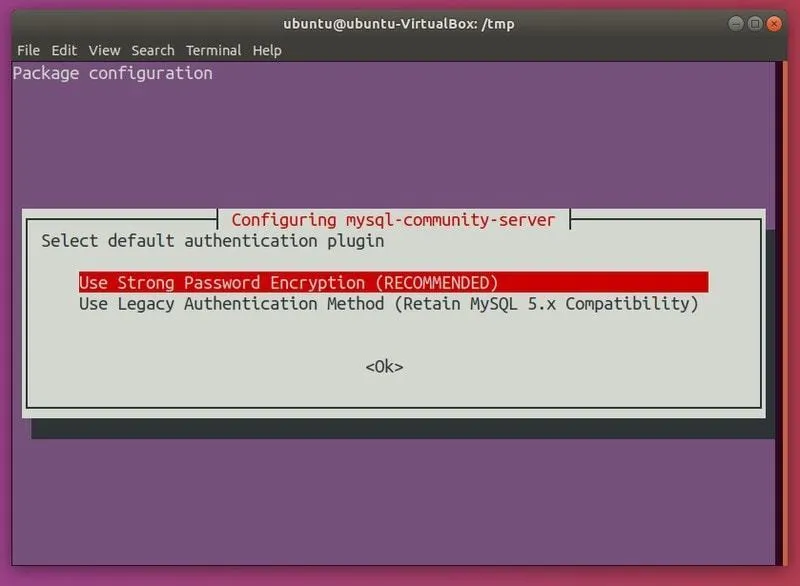 将会展示一些关于 MySQL Server 的配置信息。再次按下 Tab 去选择 “Ok” 和按下回车键: