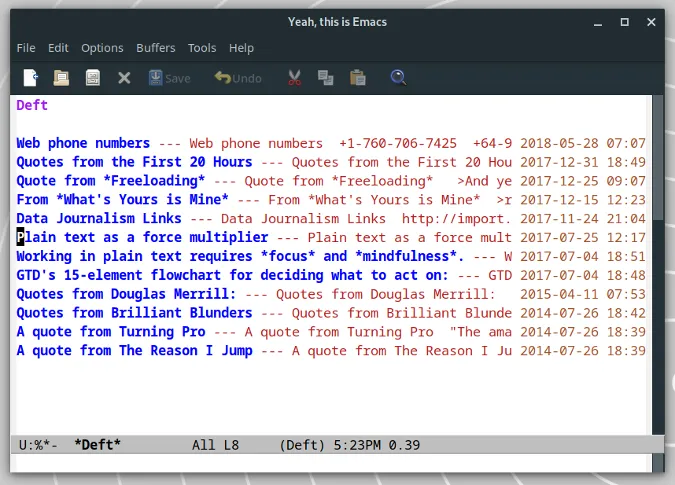 在少数情况下,我只能使用 Mac时,有一个工具是我不能缺少的:nvALT 笔记应用。Deft 模式 为 Emacs 带来了 nvALT 式的体验。