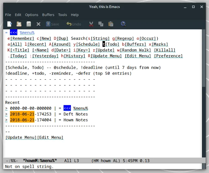 Howm 不是最漂亮的 Emacs 模式,它的用户体验也不是最佳。它需要你花一点时间来适应它,而一旦你适应了它,记录和查找笔记就是轻而易举的事情了。