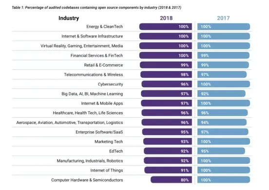 近日, 黑鸭软件 Black Duck Software 发布了开源安全与风险分析(OSSRA)年度报告,报告对 2018 年以来 1200 多个商业代码库的匿名数据进行了分析和研究。对当今的企业来说,开源软件、库和组件往往起着重要的作用。开源代码采用率高有许多原因,其中包括开源社区的许多程序员愿意为项目贡献时间、项目代码的透明性、以及比开发内部系统更少的实现时间等。