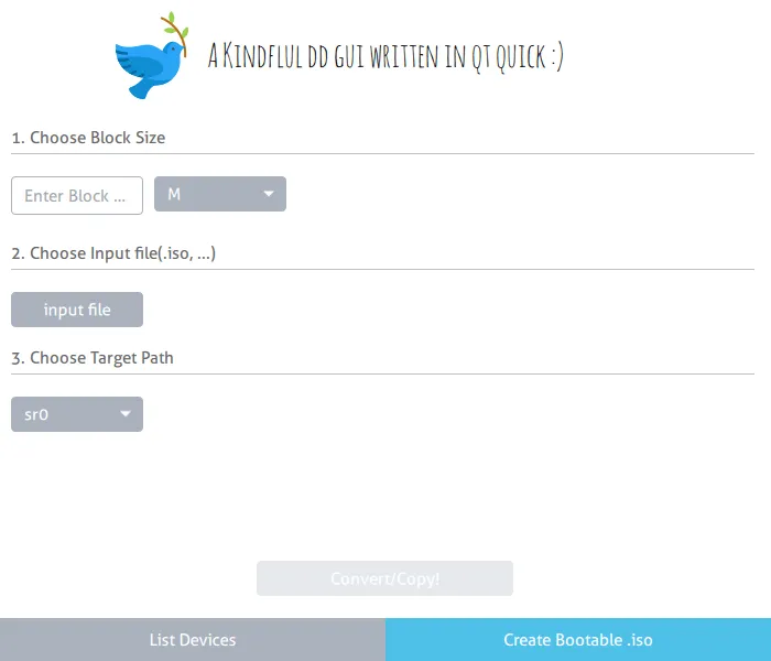 在第一列中输入块大小,在第二列中选择 ISO 文件的路径,并在第三列中选择正确的设备(USB 驱动器路径)。单击“转换/复制”按钮来开始创建可启动的 ISO 。