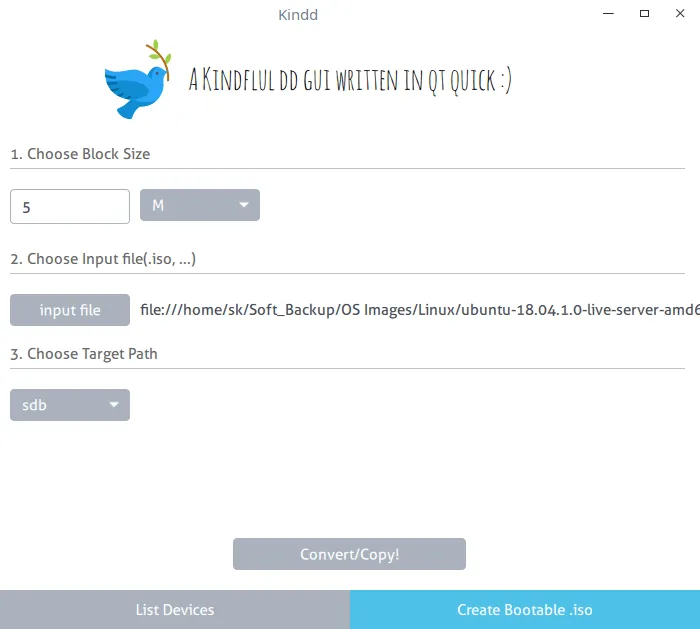 前不久,我们已经学习如何在类 Unix 系统中 使用 dd 命令创建可启动的 ISO。请记住,dd 命令是最具危险性和破坏性的命令之一。如果你不确定你实际在做什么,你可能会在几分钟内意外地擦除你的硬盘数据。dd 命令仅仅从 if 参数获取数据,并写入数据到 of 参数。它将不关心它正在覆盖什么,它也不关心是否在磁道上有一个分区表,或一个启动扇区,或者一个家文件夹,或者任何重要的东西。它将简单地做它被告诉去做的事。如果你是初学者,一般地尝试避免使用 dd 命令来做实验。幸好,这有一个支持 dd 命令的简单的 GUI 实用程序。向 “Kindd” 问好,一个属于 dd 命令的图形化前端。它是自由开源的、用 Qt Quick 所写的工具。总的来说,这个工具对那些对命令行不适应的初学者是非常有用的。