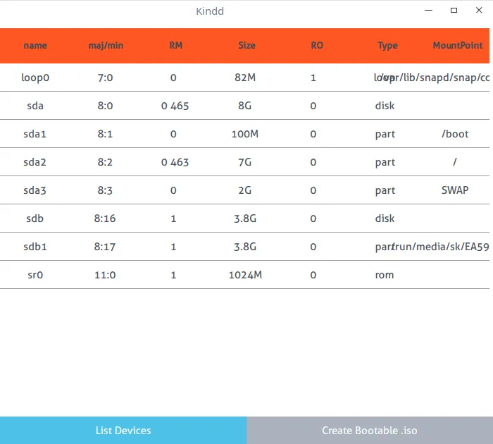 正如你所能看到的,Kindd 界面是非常简单的和明白易懂的。这里仅有两部分,即设备列表,它显示你的系统上的可用的设备(hdd 和 Usb),并创建可启动的 .iso 。默认情况下,你将在“创建可启动 .iso”部分。