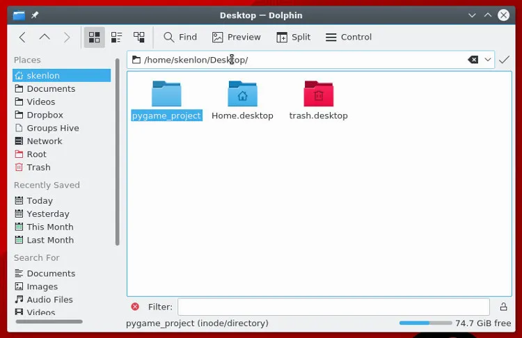 要开始一个新的 Pygame 工程,先在计算机上创建一个文件夹。游戏的全部文件被放在这个目录中。在你的工程文件夹内部保持所需要的所有的文件来运行游戏是极其重要的。