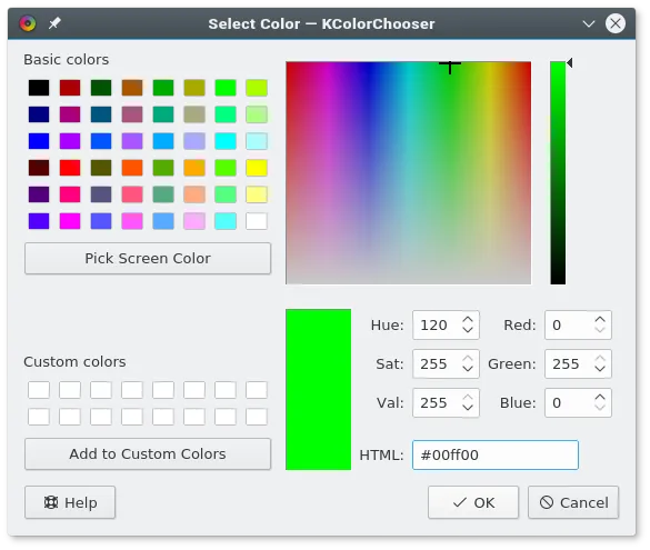 在以上示例代码中,0,255,0 被我们使用,它在 RGB 中所代表的值与 #00ff00 在十六进制中所代表的值相同。你可以通过一个优秀的图像应用程序,如 GIMP、Krita 或 Inkscape,来获取所有这些颜色值。或者,你可以使用一个优秀的系统级颜色选择器,如 KColorChooser,来检测颜色。