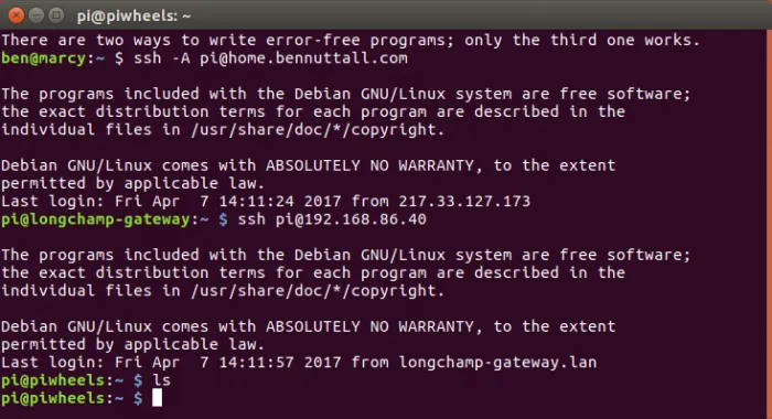 使树莓派安全后,让它在线,你将可以在世界的任何地方登录你的网络。一旦你登录到你的树莓派,你可以用 SSH 访问本地网络上的局域网地址(例如,192.168.1.31)访问其他设备。如果你在这些设备上有密码,用密码就好了。如果它们同样只允许 SSH 密匙,你需要确保你的密匙通过 SSH 转发,使用 -A 参数:ssh -A pi@123.45.67.89