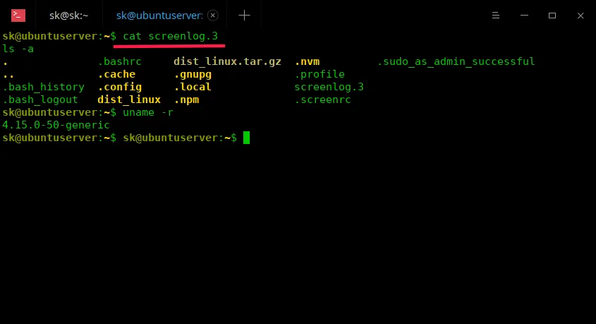 从现在开始,你在会话中做的所有活动都将记录并存储在 $HOME 目录中名为 screenlog.x 的文件中。这里,x 是一个数字。