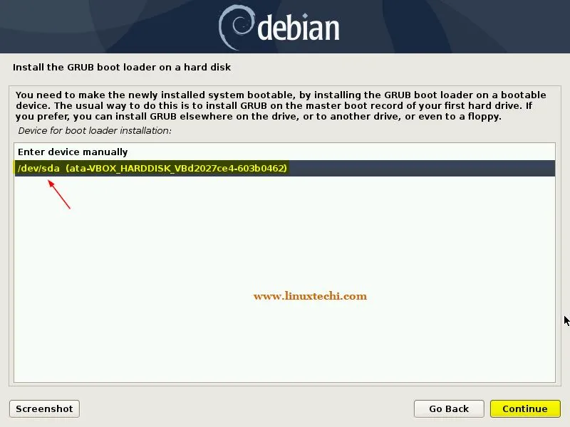 在 “Continue” 上单击来继续,然后在接下来的窗口中选择将安装引导加载程序的磁盘(/dev/sda)。
