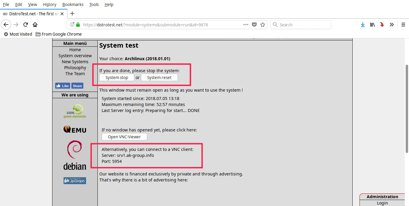 一旦试用结束,回到 DistroTest 页面并停止你试用的系统。如果你不想启用 DistroTest 页面的弹出窗口,用你本地系统安装的任意 VNC 客户端也可以。VNC 登录信息可在同一页面找到。