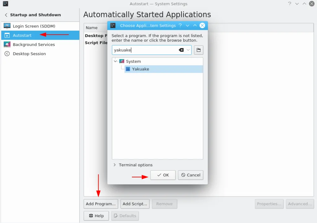 如果你运行 KDE,请打开系统设置,然后转到“启动和关闭”。将“yakuake”添加到“自动启动”下的程序列表中,如下所示:
