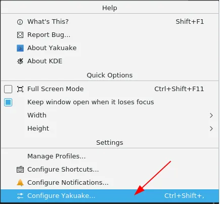 点击菜单按钮,出现如下帮助菜单。接着,选择“配置 Yakuake……”访问配置选项。