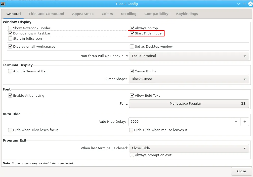 接下来,打开 Tilda 配置窗口。 选择“隐藏启动 Tilda”,即启动时不会立即显示终端。