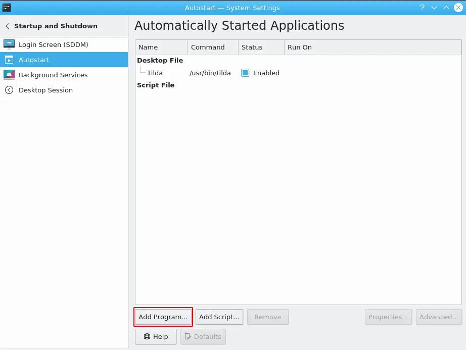接下来,你要设置你的桌面自动启动 Tilda。如果你使用的是 KDE,请转到“系统设置 > 启动与关闭 > 自动启动”并“添加一个程序”。