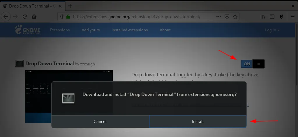 打开浏览器并转到此 GNOME 扩展的站点。启用扩展设置为“On”,如下所示:
