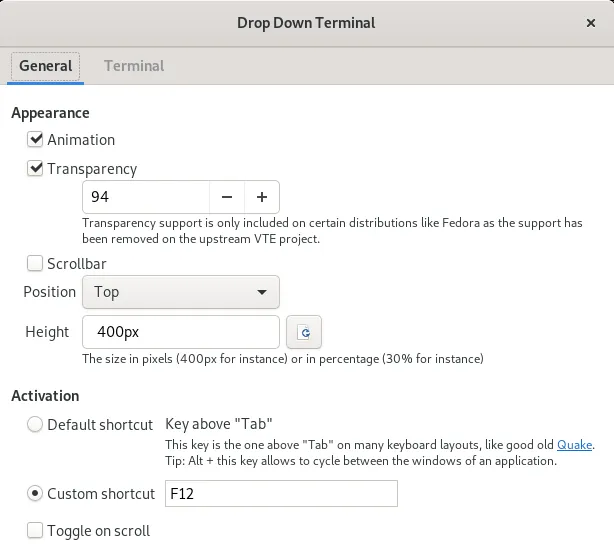 安装后,将打开 Drop-down Terminal 配置窗口以设置首选项。例如,可以设置终端大小、动画、透明度和使用滚动条。