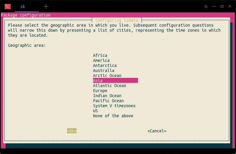 选择你居住的地理区域。对我而言,我选择 Asia。选择 OK,然后按回车键。