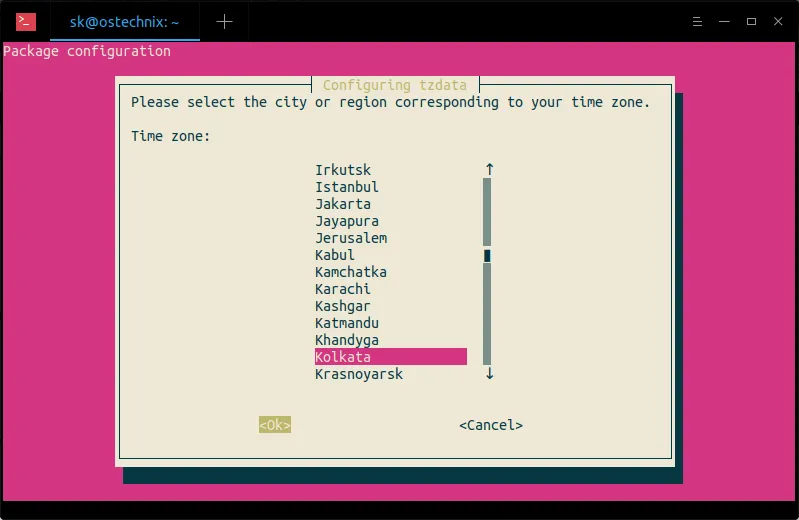 接下来,选择与你的时区对应的城市或地区。这里,我选择了 Kolkata(LCTT 译注:中国用户请相应使用 Shanghai 等城市)。