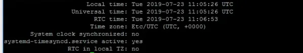 如果时钟不同步,你会看到下面截图中显示的 System clock synchronized: no。