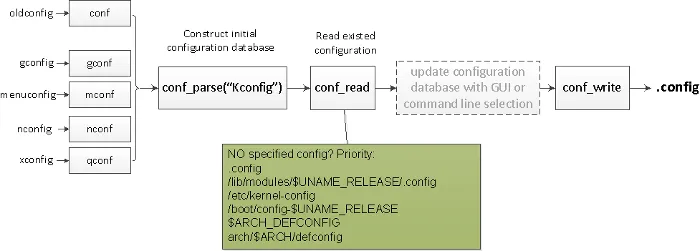 第一步读取源代码根目录下的 Kconfig 文件,构建初始配置数据库;然后它根据如下优先级读取现有配置文件来更新初始数据库: