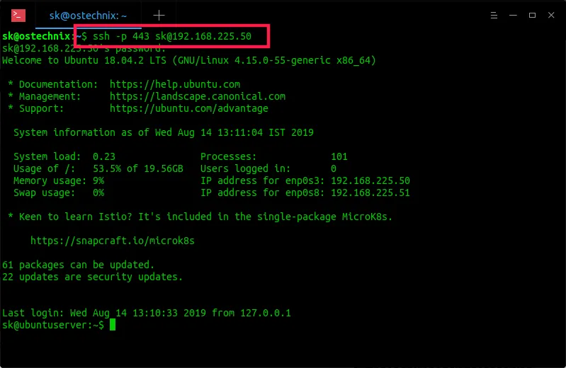看见了吗?即使默认的 SSH 端口 22 被阻止,我现在也可以通过 SSH 访问远程服务器。正如你在上面的示例中所看到的,我使用 https 端口 443 进行 SSH 连接。