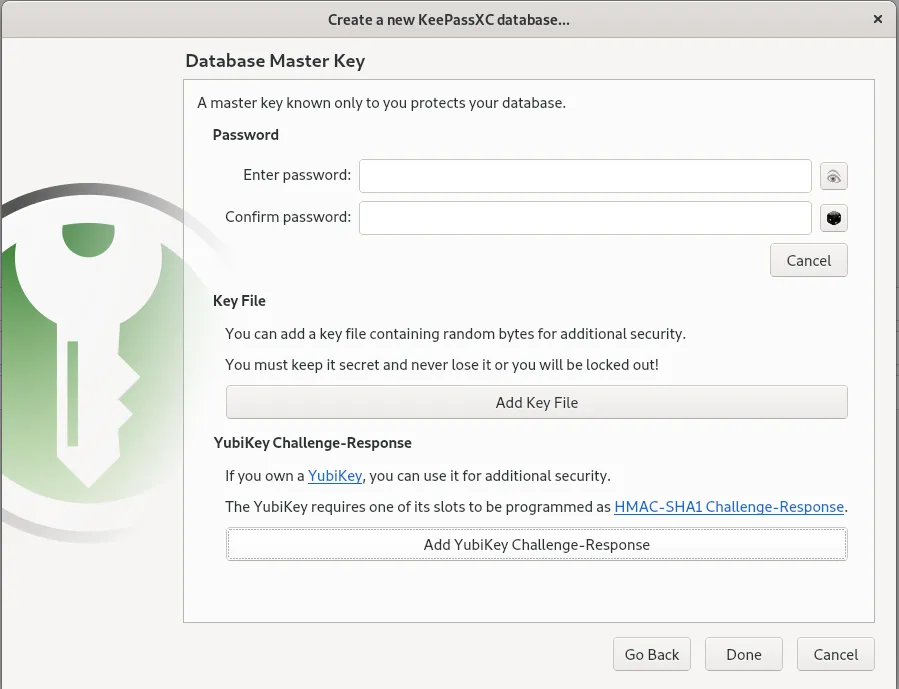- 选择主密钥和额外保护:主密钥必须易于记忆(如果丢失它,你的皮夹就会丢失!)而足够强大,一个至少有 4 个随机单词的密码可能是一个不错的选择。作为额外保护,你可以选择密钥文件(请记住:你必须始终都有它,否则无法打开皮夹)和/或 YubiKey 硬件密钥。