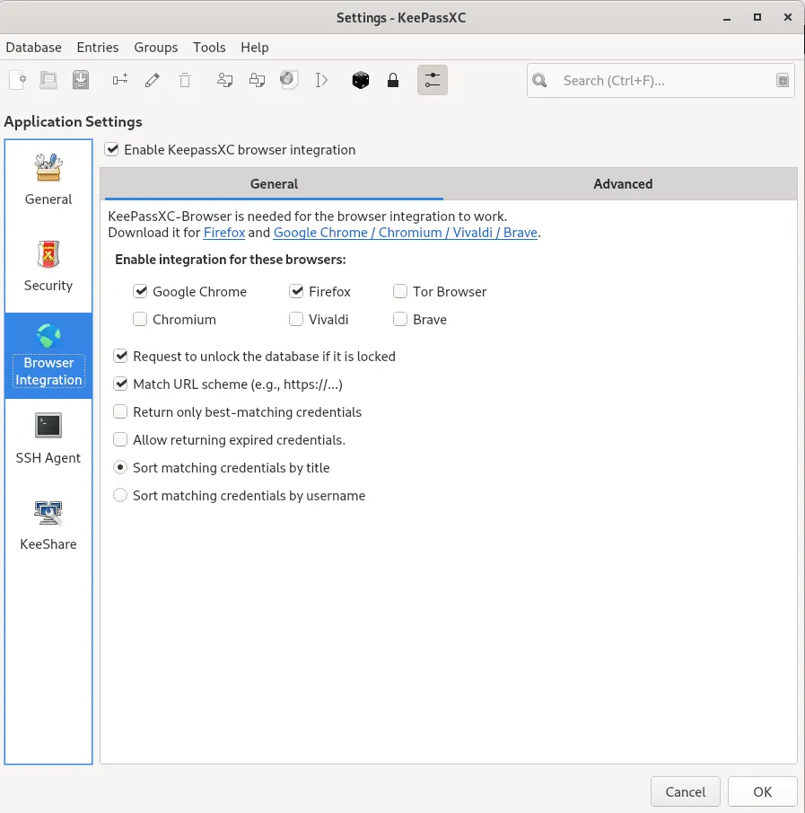 必须在 KeePassXC(工具菜单 -> 设置)上启用浏览器集成,指定你要使用的浏览器: