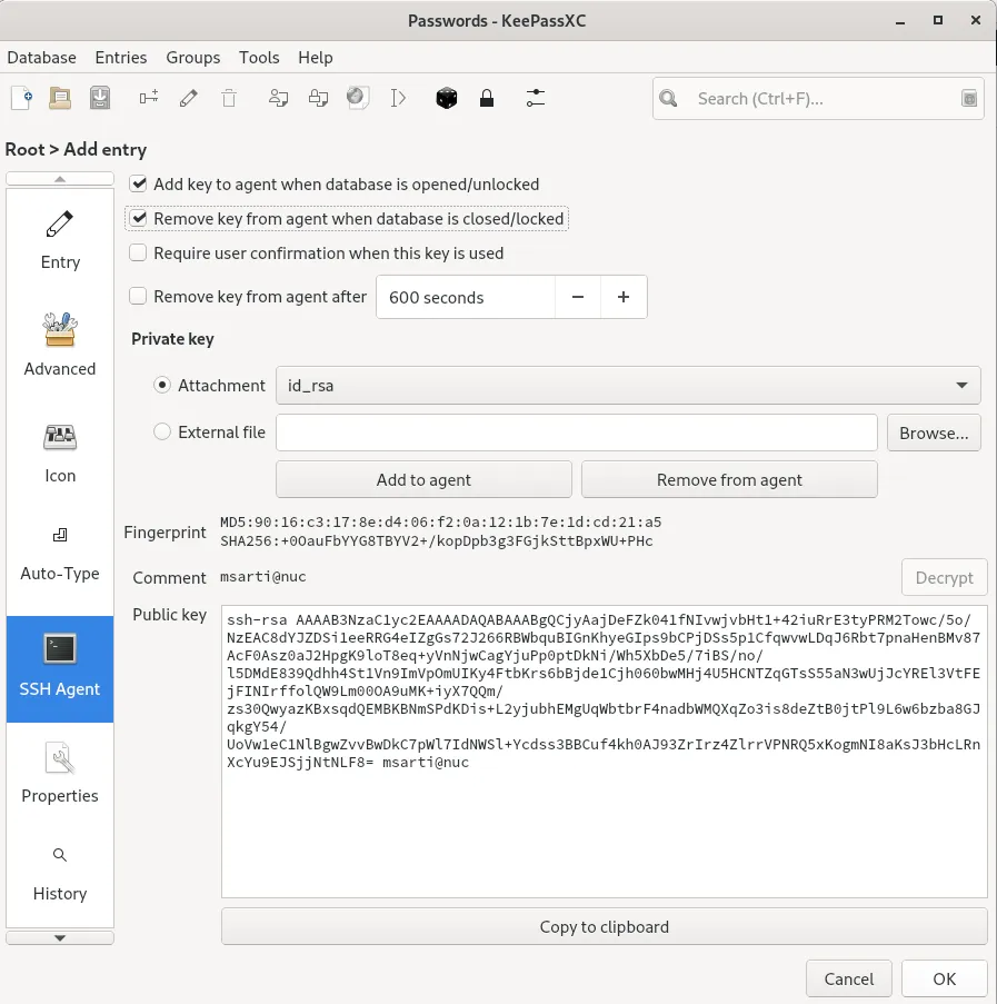 KeePassXC 的另一个有趣功能是与 SSH 集成。如果你使用 ssh 代理,KeePassXC 能够与之交互并添加你上传的 ssh 密钥到条目中。