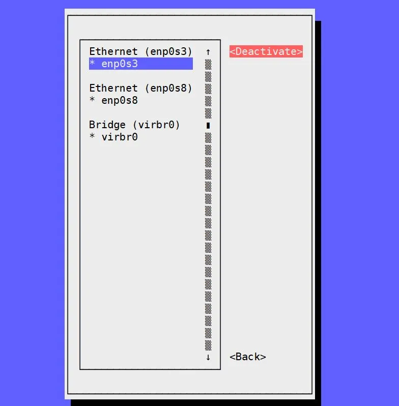 选择 “enp0s3”,选择 “Deactivate” 并点击回车,