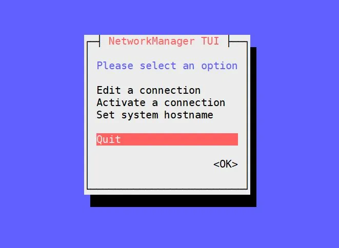 nmtui 是一个基于文本用户界面的,用于控制网络的管理器,当我们执行 nmtui 时,它将打开一个基于文本的用户界面,通过它我们可以添加、修改和删除连接。除此之外,nmtui 还可以用来设置系统的主机名。