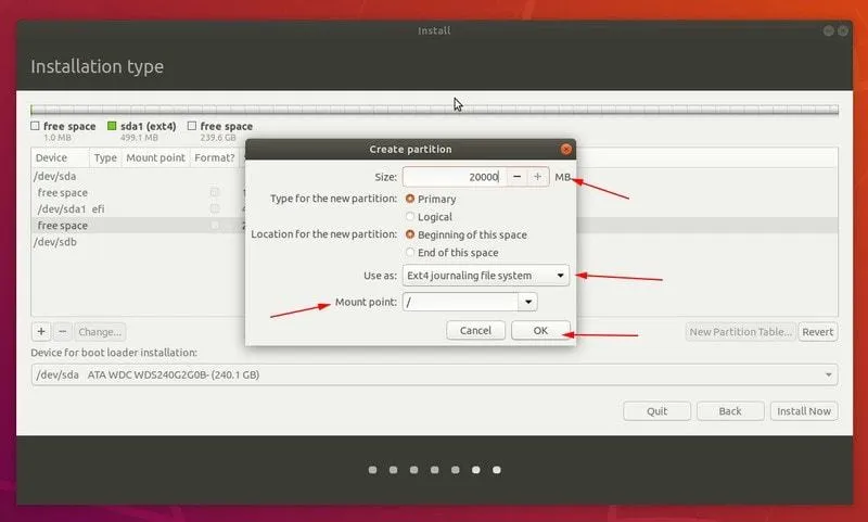 接下来,我将使用 20GB 的根分区。如果你只使用一个发行版,则可以随意地将其增加到 40GB。