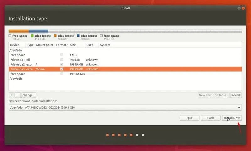 我将在磁盘上保留近 200 GB 的可用空间,以便可以在此处安装其他 Linux 发行版。你可以将其全部用于主目录分区。保留单独的根分区和主目录分区可以在你需要重新安装系统时帮你保存里面的数据。