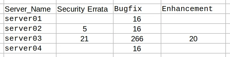 | Server_Name | Security Errata | Bugfix | Enhancement |
