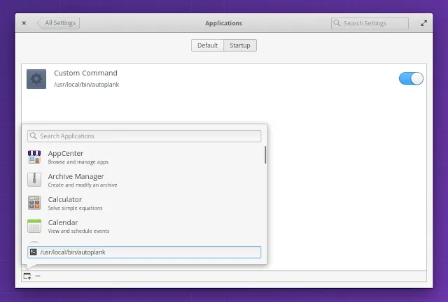在 elementary OS 中,你可以打开“系统设置”,然后在“应用程序”的“启动”选项卡上,单击窗口左下角的“+”按钮,然后在“键入自定义命令”字段中添加 “/usr/local/bin/autoplank”: