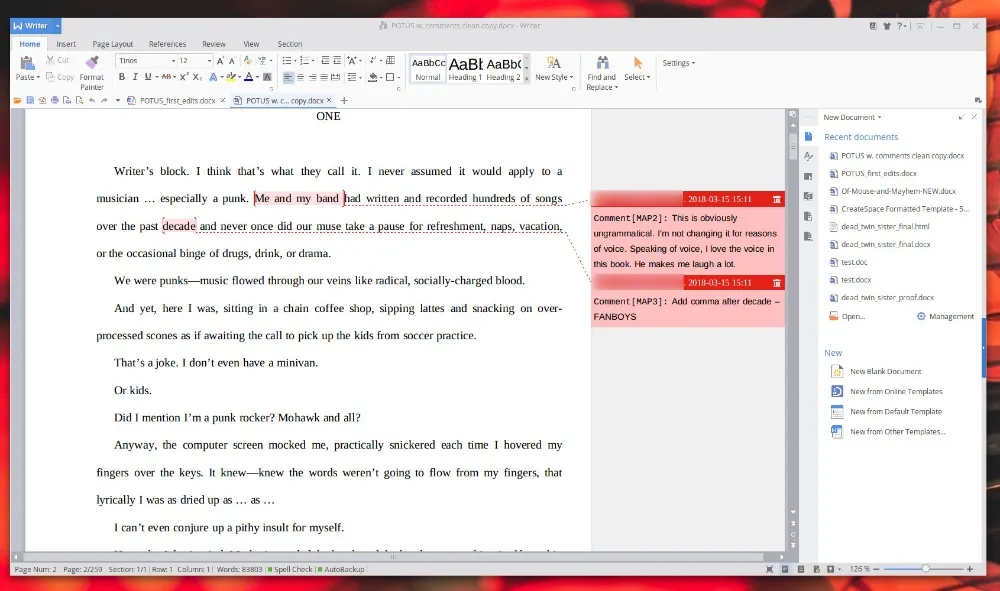 该过程的下一步变得有些琐碎。我的编辑更喜欢使用注释来跟踪更改(因为这使我们俩阅读文档和做出更改一样容易)。因此,一个 60k 的 word 文档可以包含成百上千的注释,这会使 LibreOffice 慢的像爬一样。从前,你可以增加用于文档的内存,但是从 LibreOffice 6 开始,这不再可行。这意味着任何较大的、像小说一样长的、带有大量注释的文档都将无法使用。因此,我不得不采取一些极端的措施,使用 WPS Office(图 3)。尽管这不是开源解决方案,但 WPS Office 在文档中包含大量注释的情况下做得很好,因此无需处理 LibreOffice 所带来的麻烦(当处理带有数百个注释的大型文件时)。
