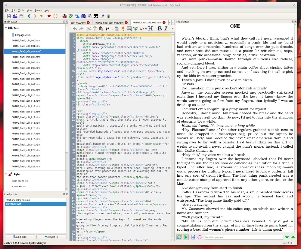 一旦我和我的编辑完成了对书的编辑(所有评论都已删除),我就可以在 LibreOffice 中打开文件进行最终格式化。格式化完成后,我将文件保存为 .html 格式,然后以 Calibre 打开文件以将文件导出为 .mobi 和 .epub 格式。