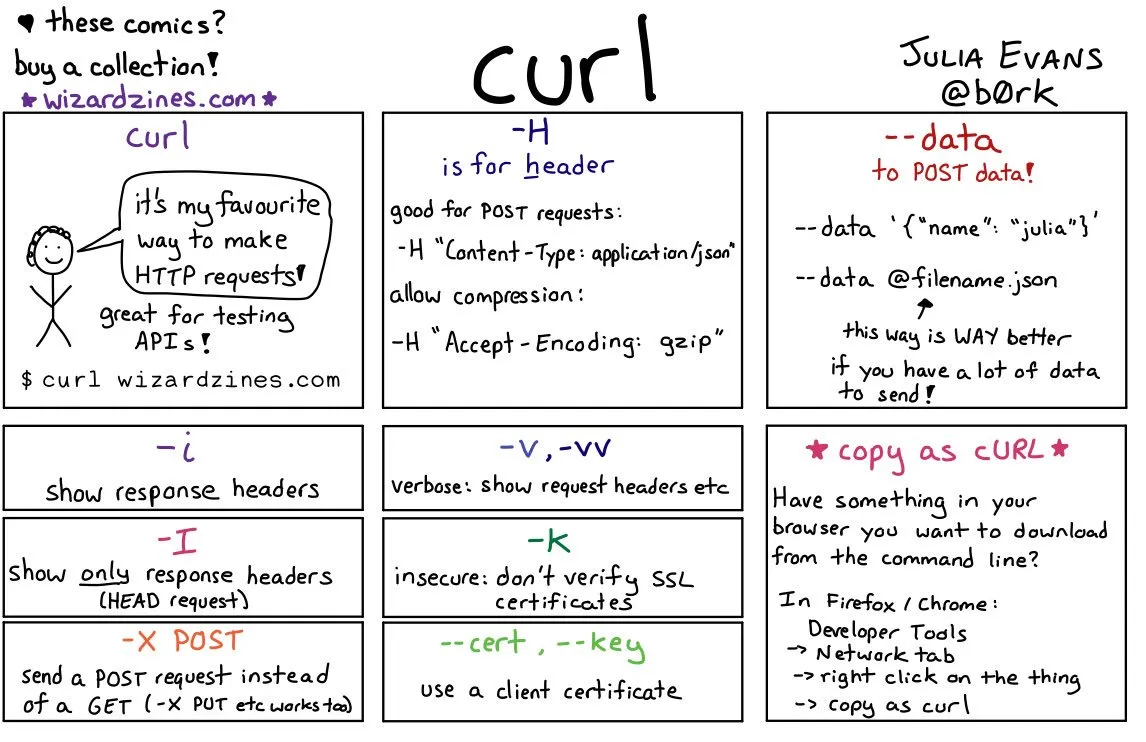 下面是一幅解释 curl 常用命令行参数的漫画 (在我的 Bite Size Networking 杂志的第 6 页)。